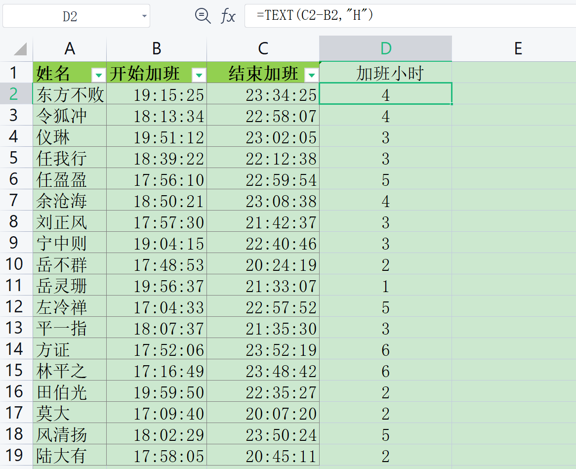这个问题小时数好解决,就是=TEXT(C2-B2,"H")这个公式,