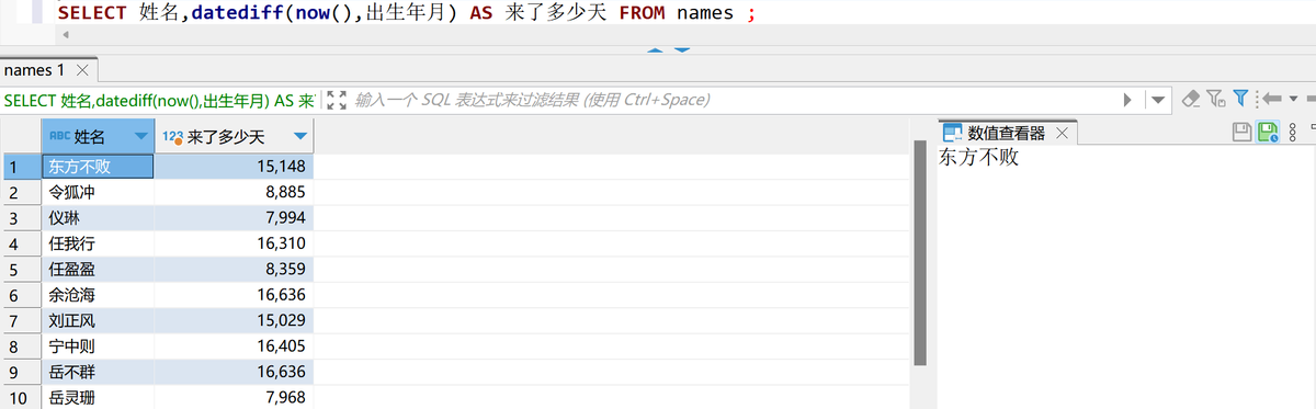 SELECT 姓名,datediff(now(),出生年月) AS 来了多少天 FROM names ;