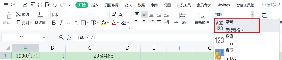 我们也可以反向转换,在单元格输入数值1,然后把格式调整为日期格式,我们就会得到1900/1/1