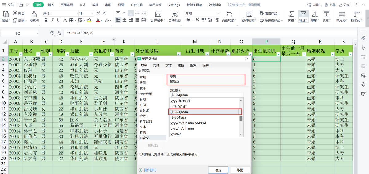 我们得到的星期只是数学显示,需要调整成显示”星期几”这种格式,找到自定义格式,选4个a那一项,或者把公式直接用TEXT函数转为4个a格式:=TEXT(WEEKDAY(M2,2),"aaaa")