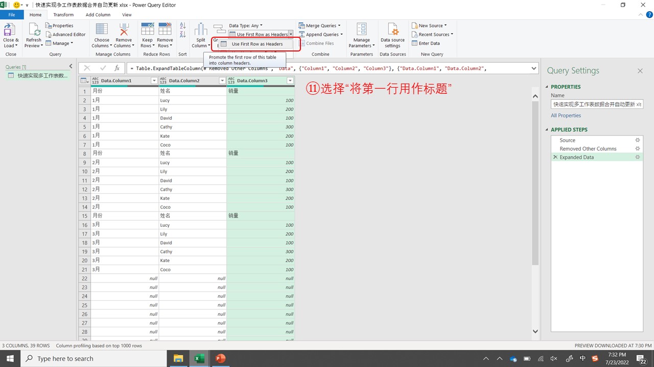 - 选择“将第一行用作标题”⑪。