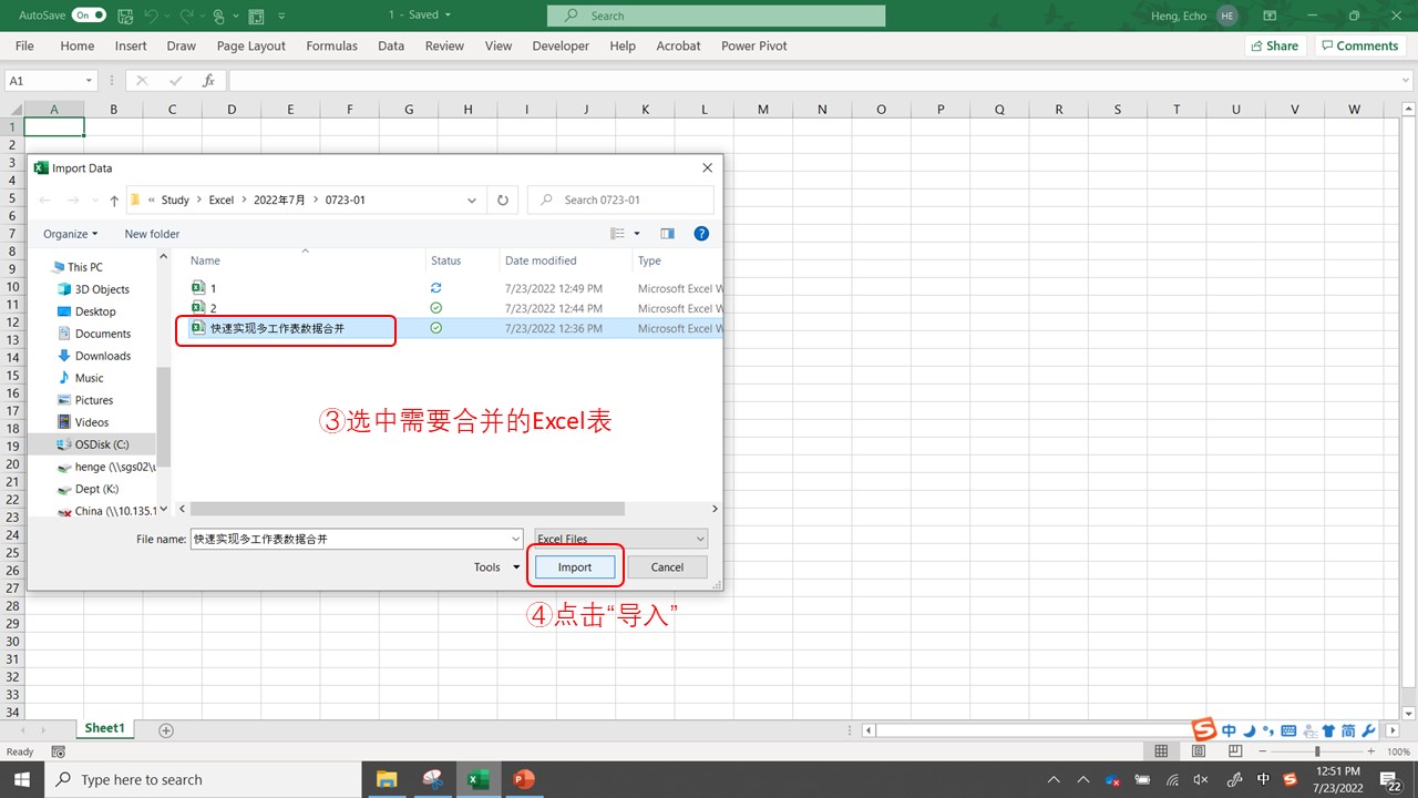 - 选中需要合并的工作簿③,点击“导入”④。