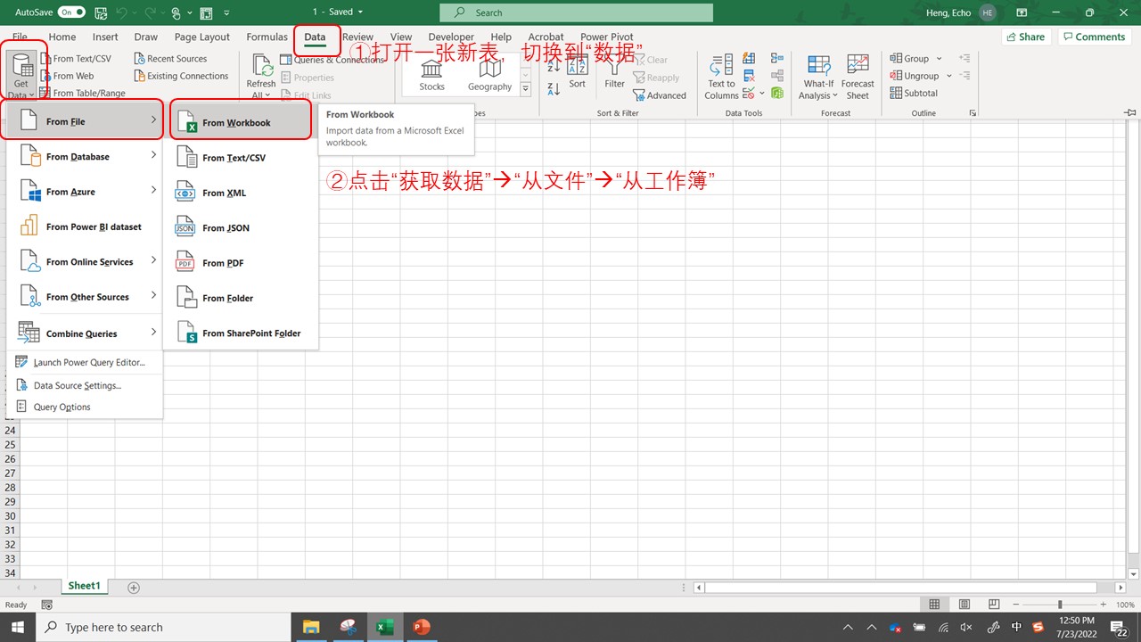 - 打开一个工作簿,切换到“数据”选项卡①,点击“获取数据”——>点击“从文件”——>点击“从工作簿”②。