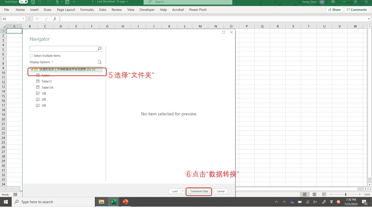 - 选中工作簿⑤,点击“数据转换”⑥。