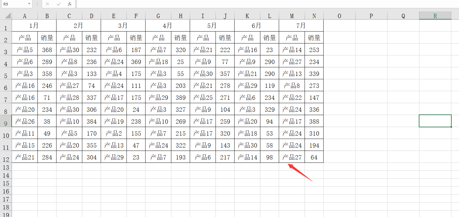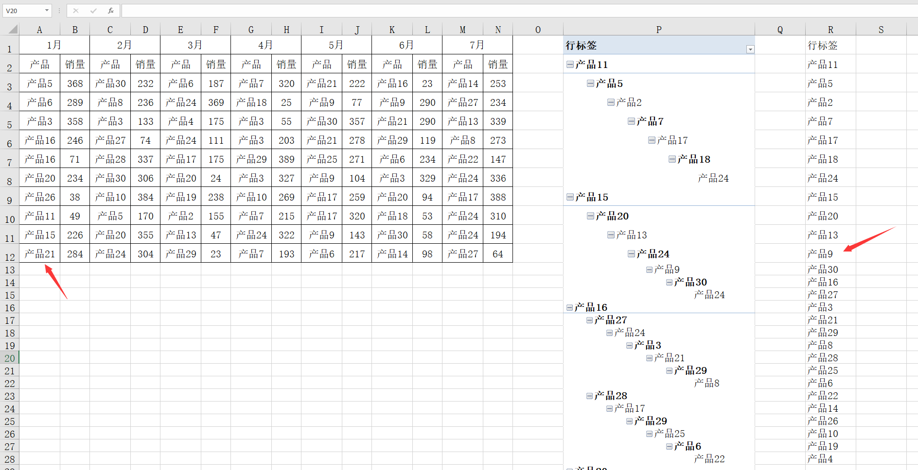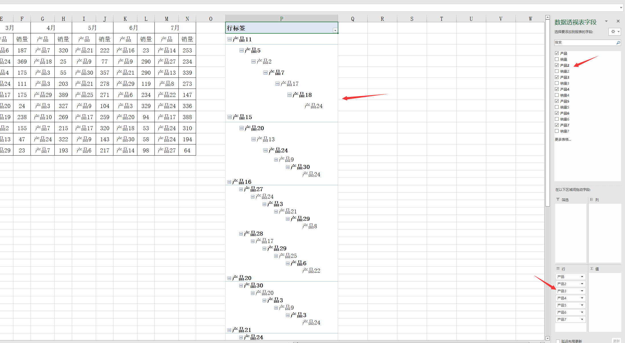メ分别把产品依次拖动到行字段中,生成单列透视表。メ