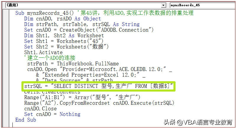 2 利用ADO,实现工作表数据的排重处理的代码及代码解读