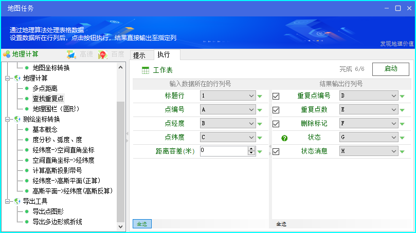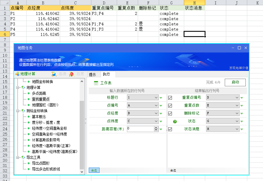 使用小O地图【地理计算 / 查找重复点】的功能。下图,按表格数据设置输入和输出列号。