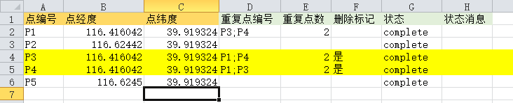 上图中经过执行,D列显示与当前行的重复点编号;E列显示了重复点个数,F列标记是的,可以删除,删除后仅保留重复点行数。
