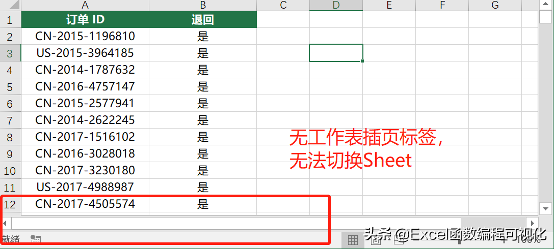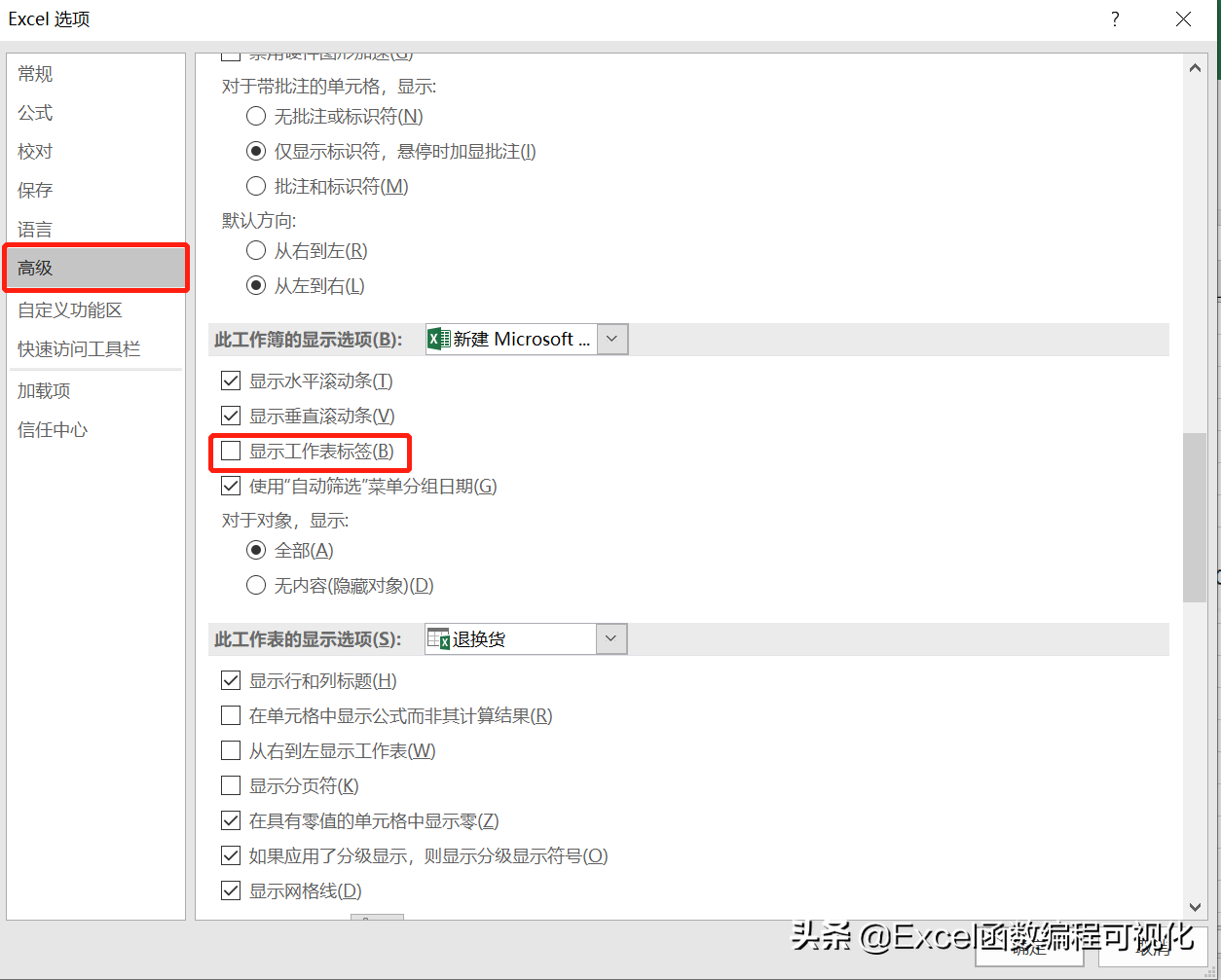 除了以上两种隐藏工作表插页的方法外,还有一种方法就是“不显示工作表标签”,设置完毕后,当前工作簿底部不显示工作表标签,自然而然无法切换工作表,变相的隐藏了工作表。