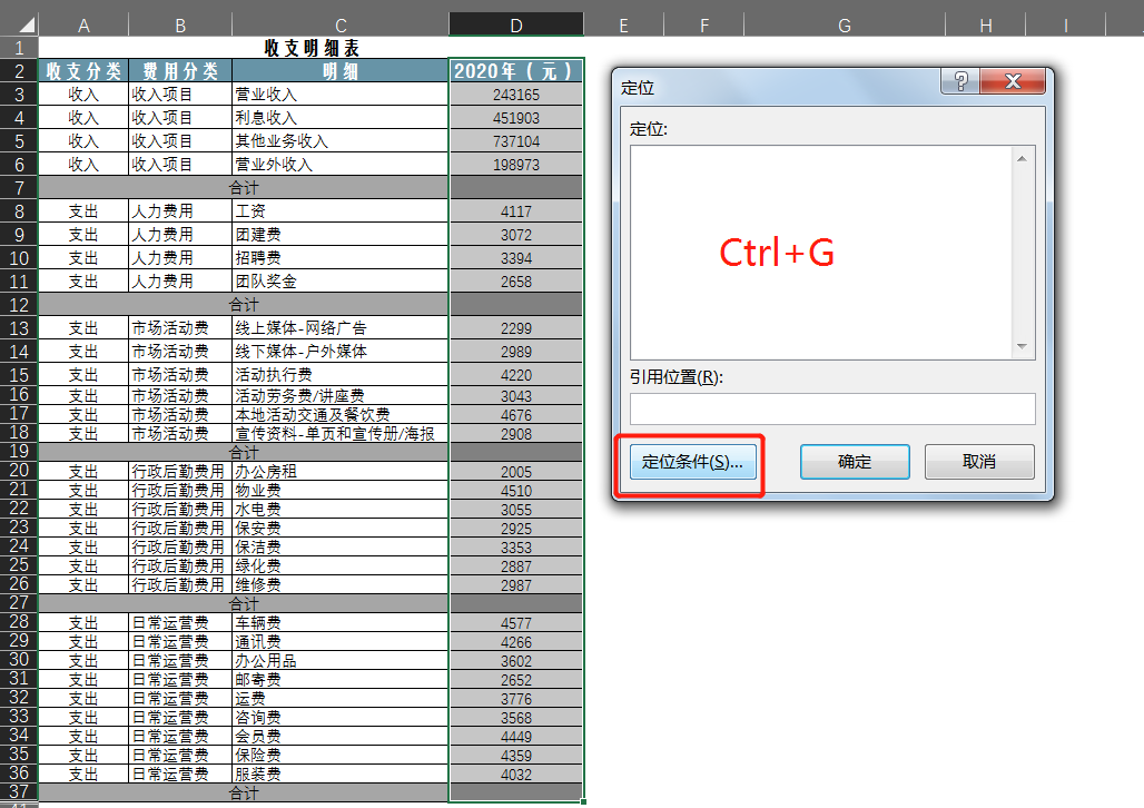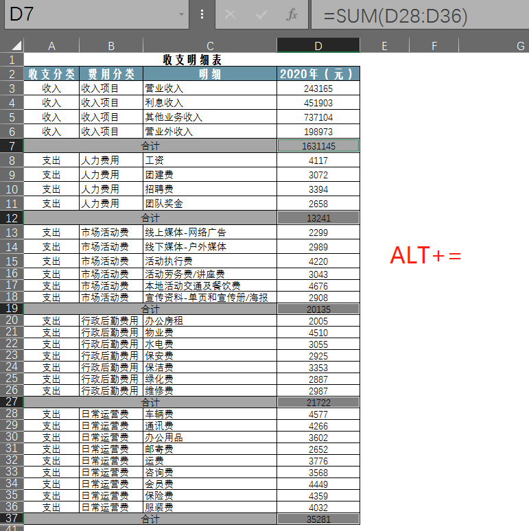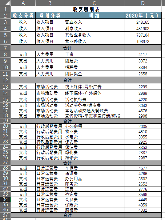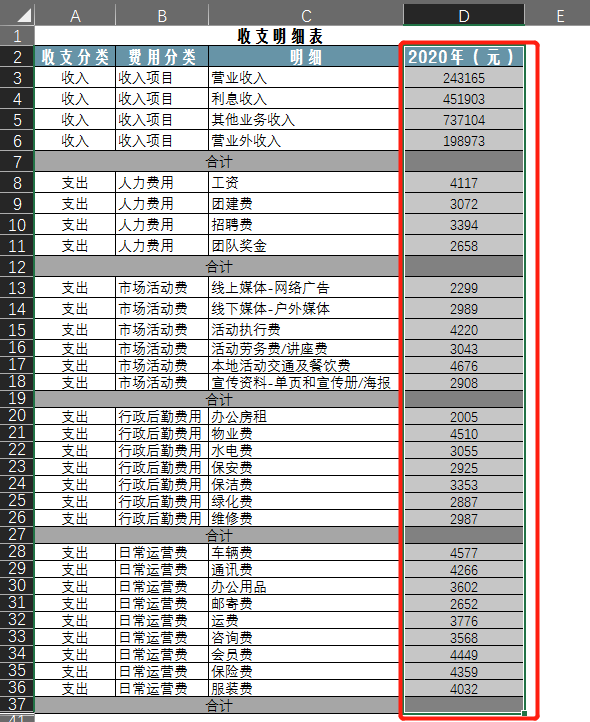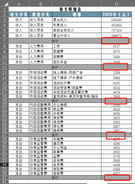如下图所示,是一份公司财务的收支明细报告,现在需要对收支表里的每项明细分别求和,该如何批量化操作?