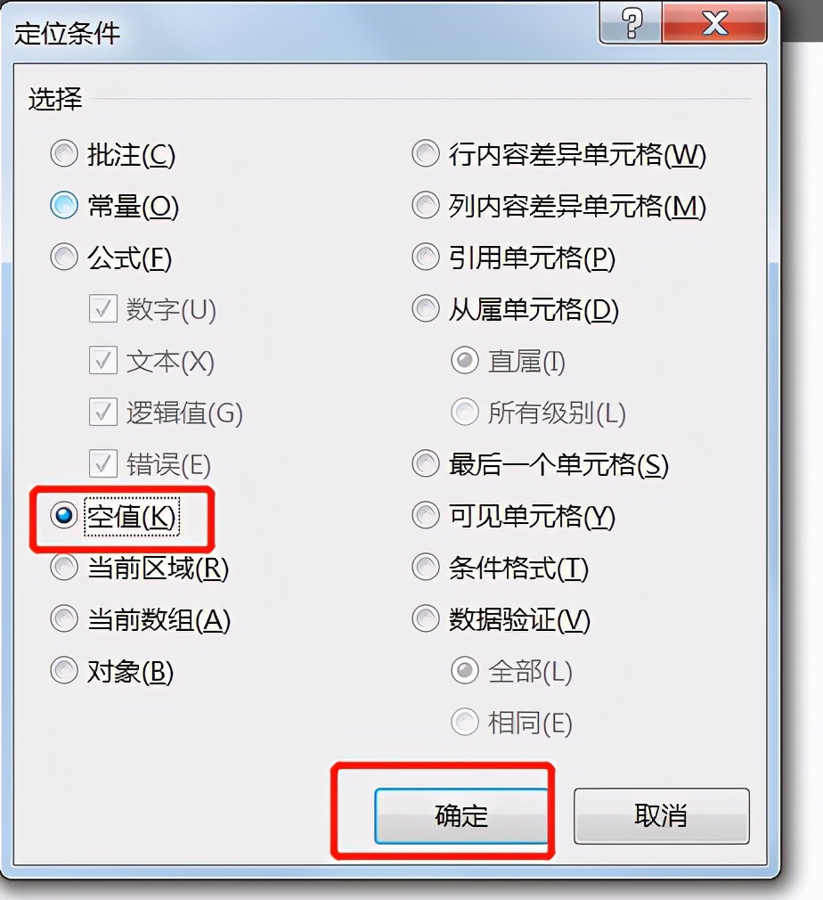 步骤4、在【定位条件】对话框里选择【空值】,然后【确定】,如下图所示: