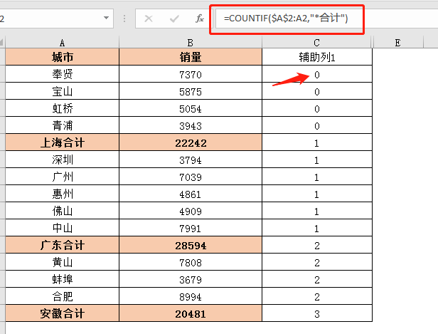 =COUNTIF($A$2:A2,"*合计"),*号为通配符,用于实现模糊统计。