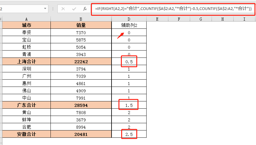 =IF(RIGHT(A2,2)="合计",COUNTIF($A$2:A2,"*合计")-0.5,COUNTIF($A$2:A2,"*合计"))
