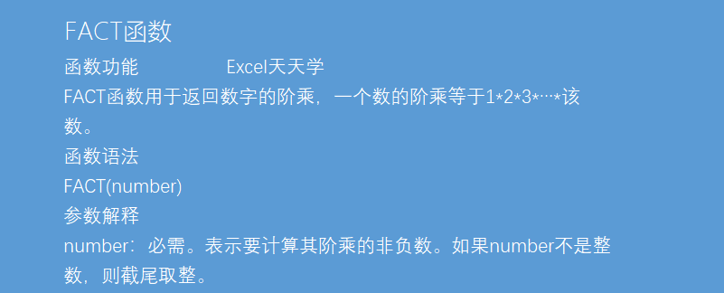 下面我们一起来了解一下FACT函数的功能、语法以及参数解释。