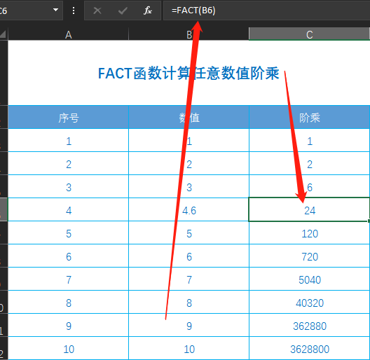 下面我们在来计算一下非正整数的阶乘,具体的计算公式为:=FACT(B6)