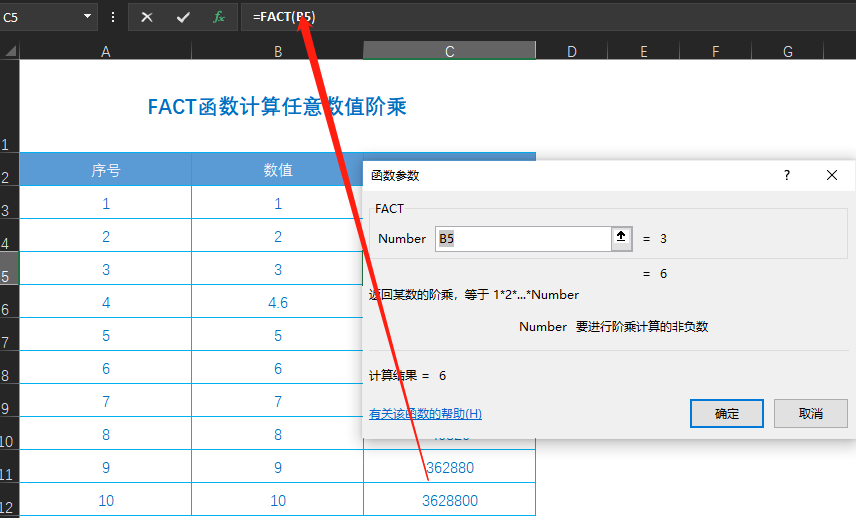 下面我们通过一个实际的案例来对FACT函数进行更进一步的了解。今天我们这个例子非常的简单,就是计算不同非负数的阶乘,我们先计算一个简单数值3的阶乘,具体计算的公式为:=FACT(B5)