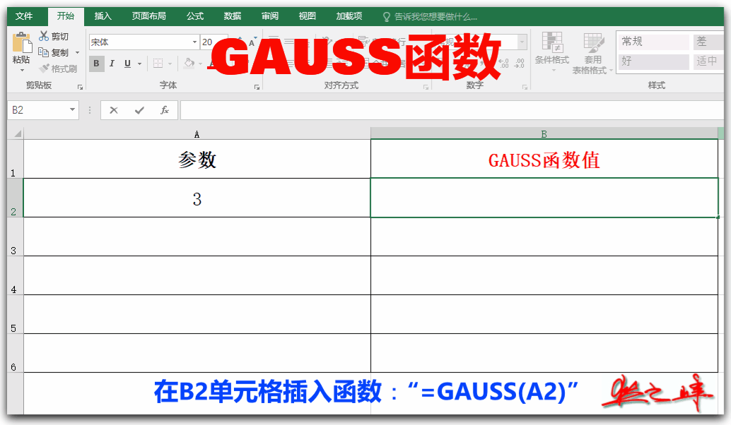 在B2单元格插入函数:“=GAUSS(A2)”,按【Enter】键确认。