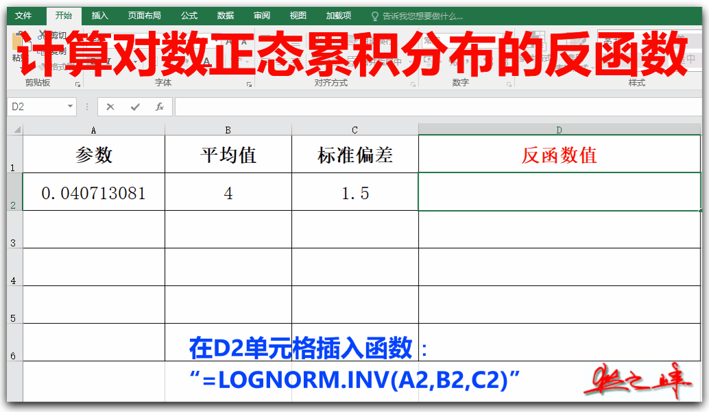 在D2单元格插入函数:“=LOGNORM.INV(A2,B2,C2)”,按【Enter】键确认。
