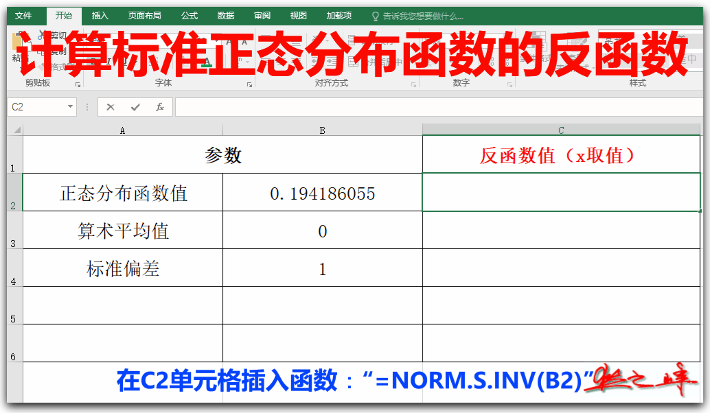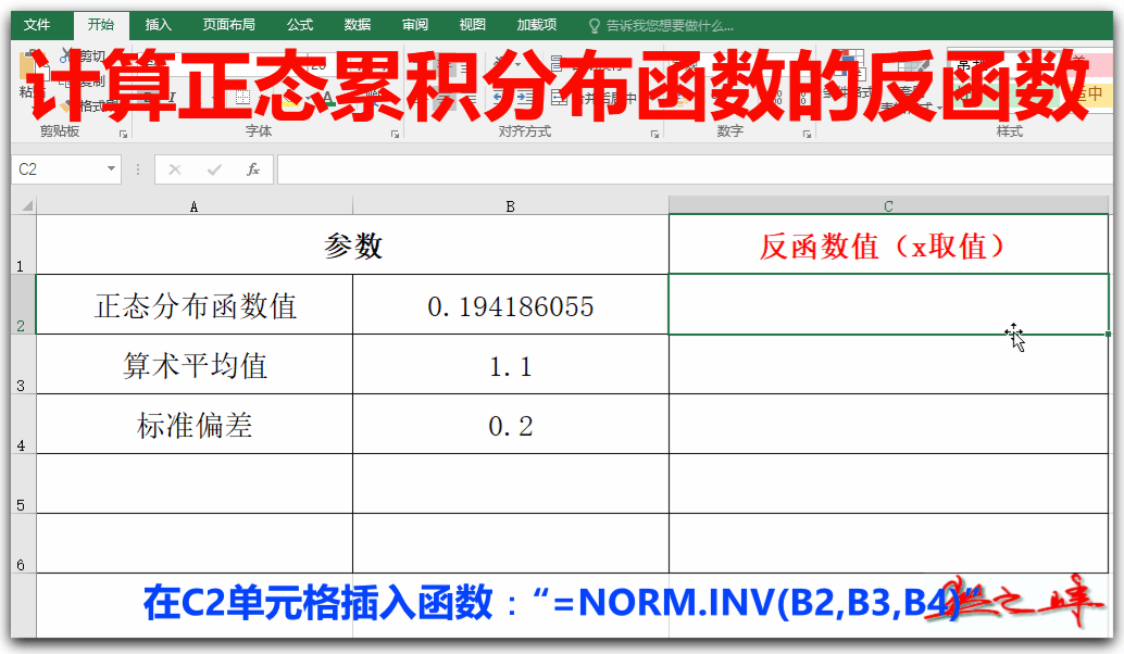 在C2单元格插入函数:“=NORM.INV(B2,B3,B4)”,按【Enter】键确认。