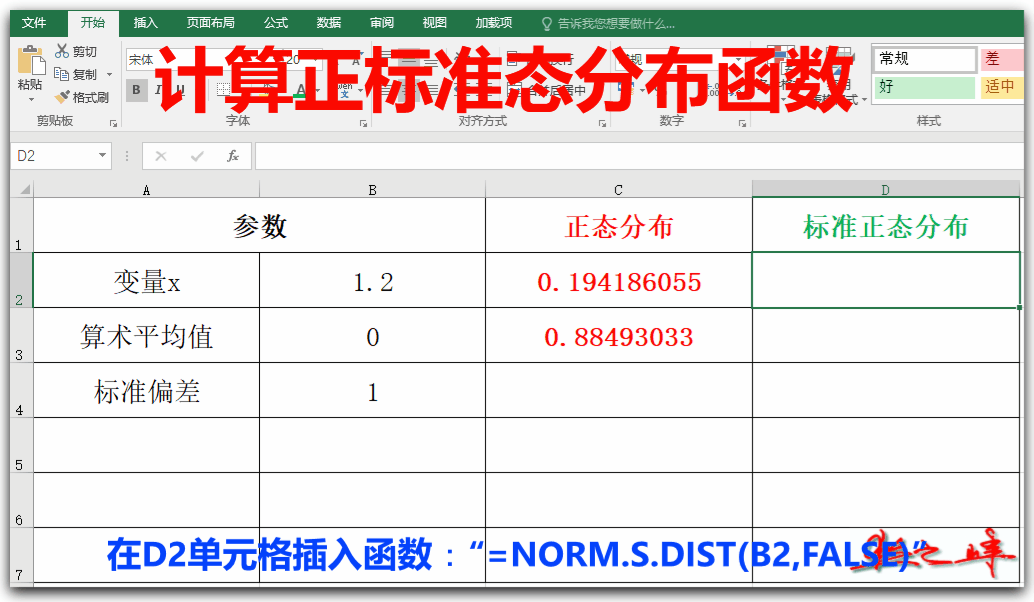 1)在D2单元格插入函数:“=NORM.S.DIST(B2,FALSE)”,按【Enter】键确认;