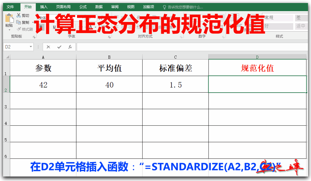 语法是:“=STANDARDIZE(x, mean, standard_dev)”。