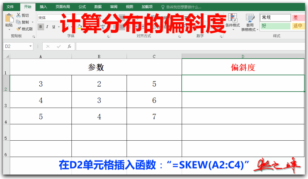 在D2单元格插入函数:“=SKEW(A2:C4)”,按【Enter】键确认。