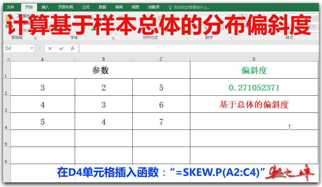 在D4单元格插入函数:“=SKEW.P(A2:C4)”,按【Enter】键确认。
