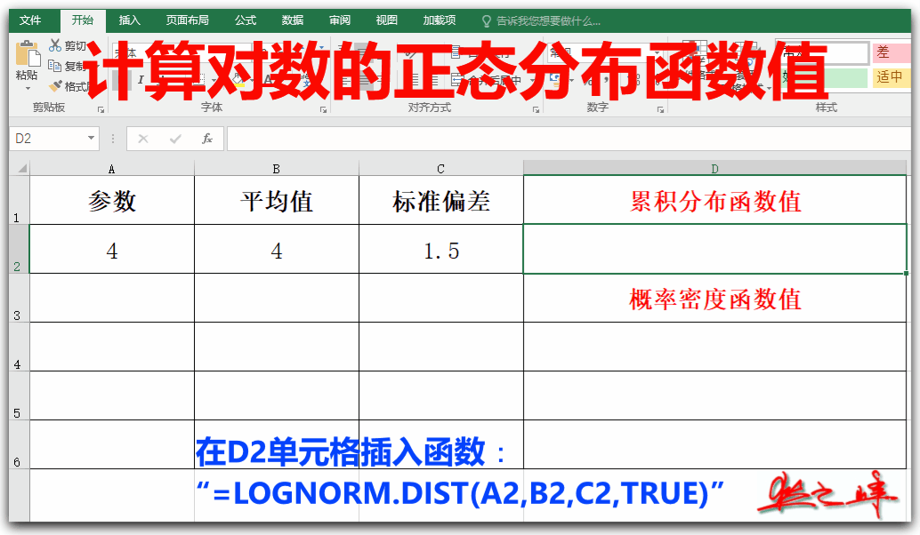 2)在D4单元格插入函数:“=LOGNORM.DIST(A2,B2,C2,FALSE)”,按【Enter】键确认。