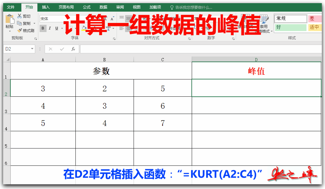 在D2单元格插入函数:“=KURT(A2:C4)”,按【Enter】键确认。