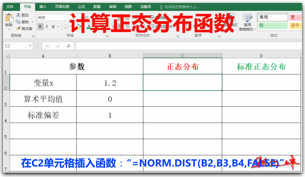 1)在C2单元格插入函数:“=NORM.DIST(B2,B3,B4,FALSE)”,按【Enter】键确认;