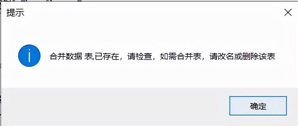 MsgBox " 合并数据 表,已存在,请检查,如需合并表,请改名或删除该表", vbInformation, "提示"