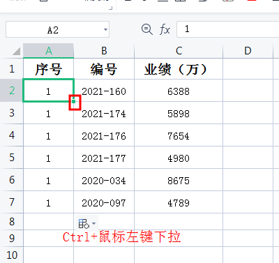 ②如果序号都是相同的数字,例如1。只需要在第一个单元格内输入数字1,然后按住【Ctrl】键在按单元格右下角的填充柄向下拖动