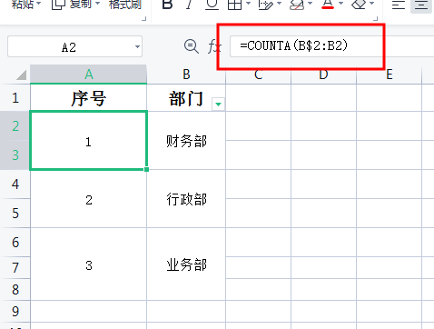 在A2单元格中输入公式【SUBTOTAL(3,B$1:B2)-1】