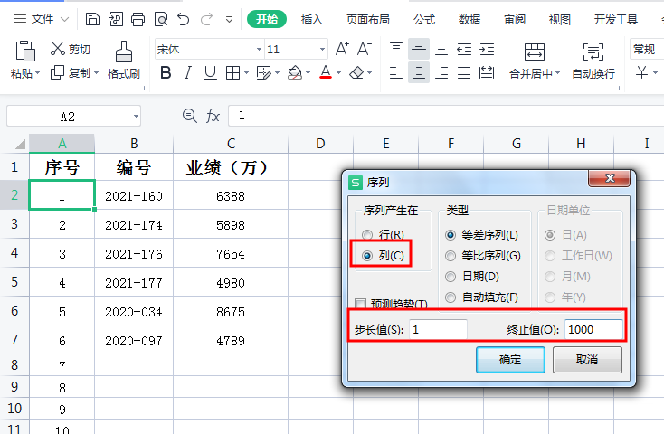 在序列小窗口中选择【列】,步长值【1】,终止值【1000】,最后【确定】即可快速生成。