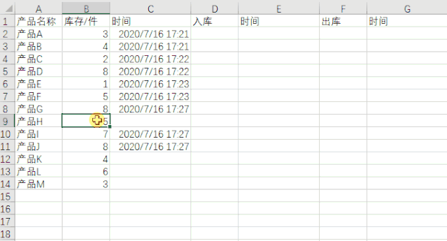 之后,在 A 列输入数据,B 列就会自动记录时间了。