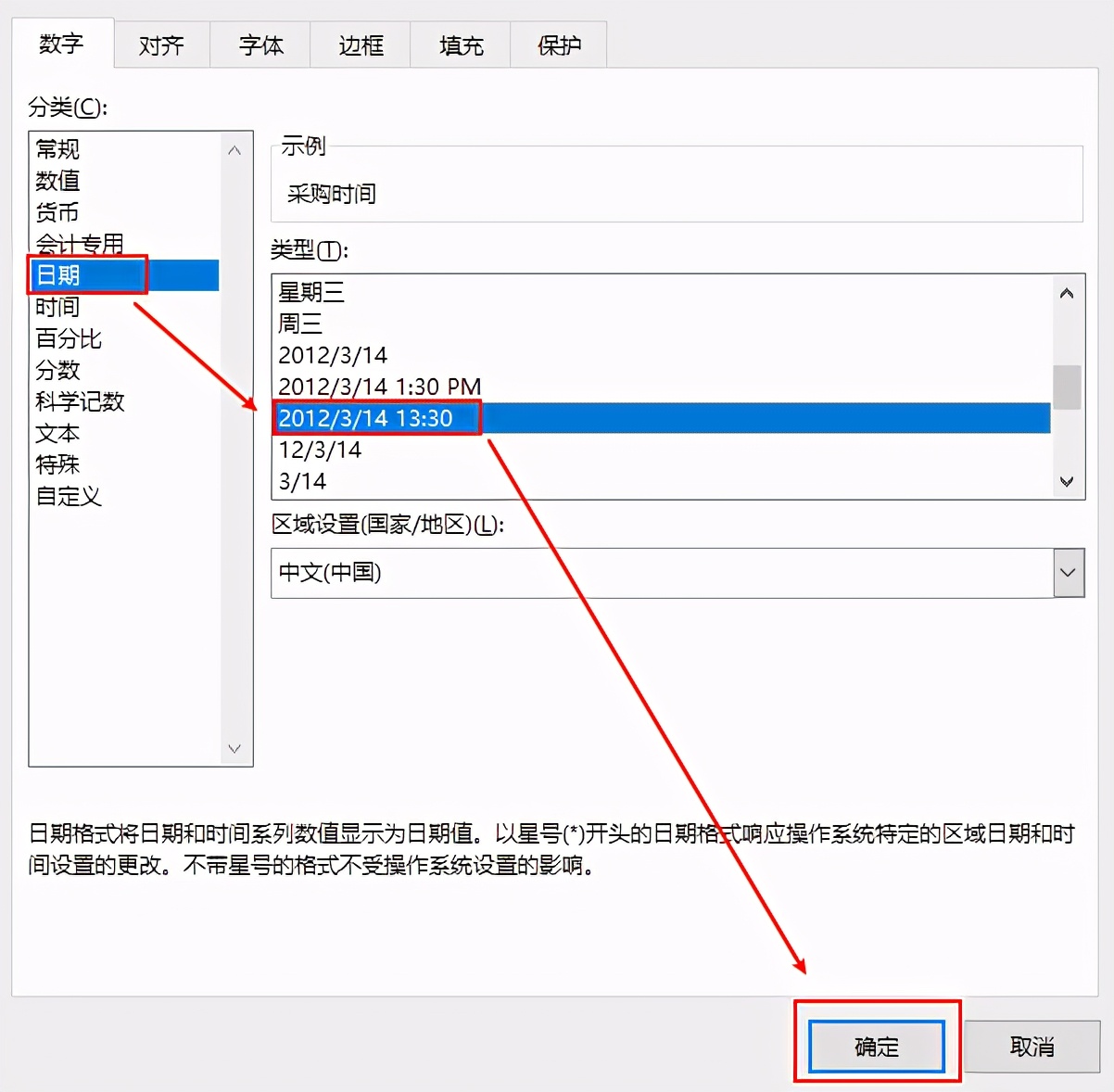 选中 B 列,【Ctrl+1】打开设置单元格格式,选择「日期」-「2012/3/14 13:30」。