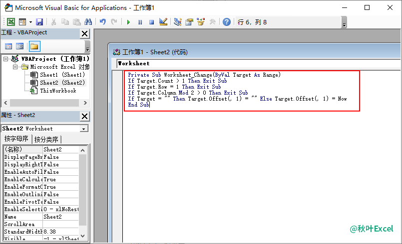 ❶ VBA 法:修改数据后,日期时间随之变化。