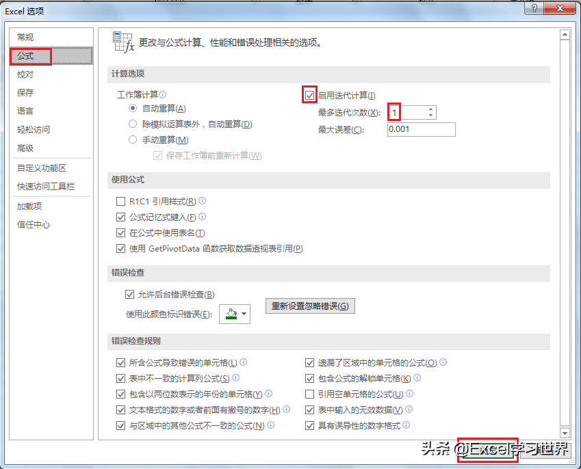2. 在弹出的对话框中选择“公式”--> 勾选“计算选项”区域的“启用迭代计算”,在“最多迭代次数”中填写“1”--> 确定