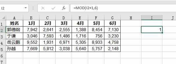 - =MOD(I2+1,6):因为本案例中只有 6 个月,所以对 6 取余数,使之在 0 到 5 之间循环