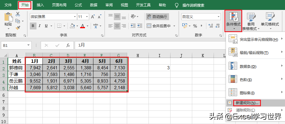 选中需要高亮显示的 B1:G5 区域 --> 选择菜单栏的“开始”-->“条件格式”-->“新建规则”