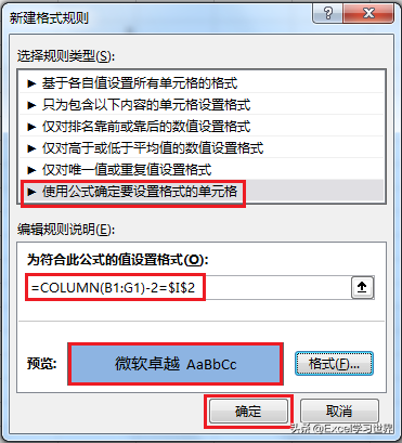 5. 在弹出的对话框中选择最下面的“使用公式确定要设置格式的单元格”,进行如下设置 --> 确定: