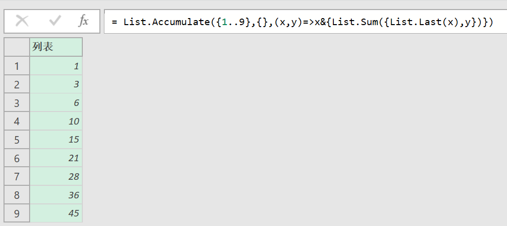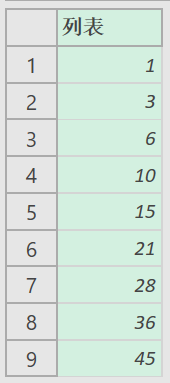 = List.Accumulate({1..9},{},(x,y)=>x&{List.Sum({List.Last(x),y})})