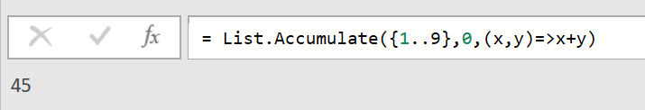 = List.Accumulate({1..9},0,(x,y)=>x+y)