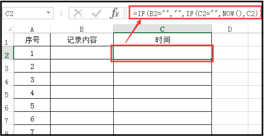这时,我们返回表格中,在B列录入数据时,C列就会自动显示当前录入数据的时间。