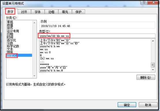 右键C列录入时间单元格区域—【设置单元格格式】—【数字】—【自定义】,在右侧的类型输入框里,输入:yyyy/mm/dd hh:mm:ss。