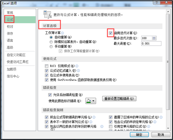 点击【文件】—【选项】—【公式】—【计算选项】,勾选【启用迭代计算】,最后点击【确定】。