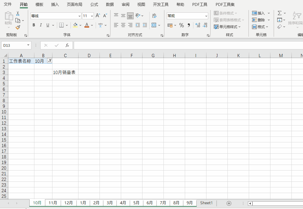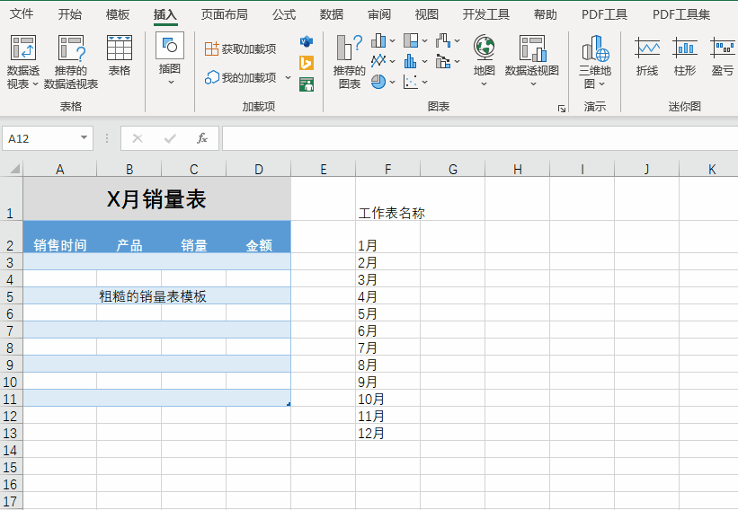 我们的需求是批量创建1月至12月的12个销量表,以月份作为每个工作表的名称,然后批量设置好每个工作表的表头和内容格式。