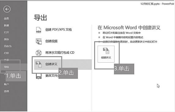 打开PPT文件样式文稿,单击【文件】中【导出】选项,找到【创建讲义】选项。