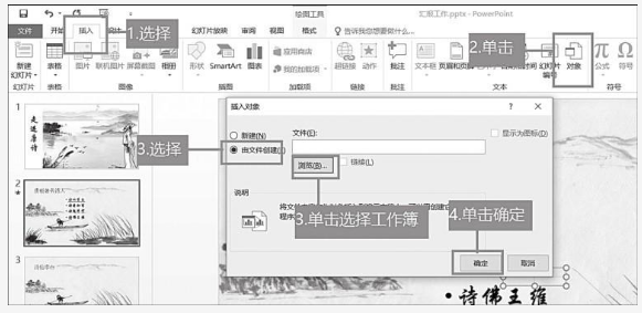 打开PowerPoint2016文件,单击【插入】选项卡中【文本】选项组中【对象】按钮,在弹出的对话框中,单击【由文件创建】,然后单击【浏览】按钮,选择所需插入的Excel工作溥,返回对话框,单击【确定】按钮。