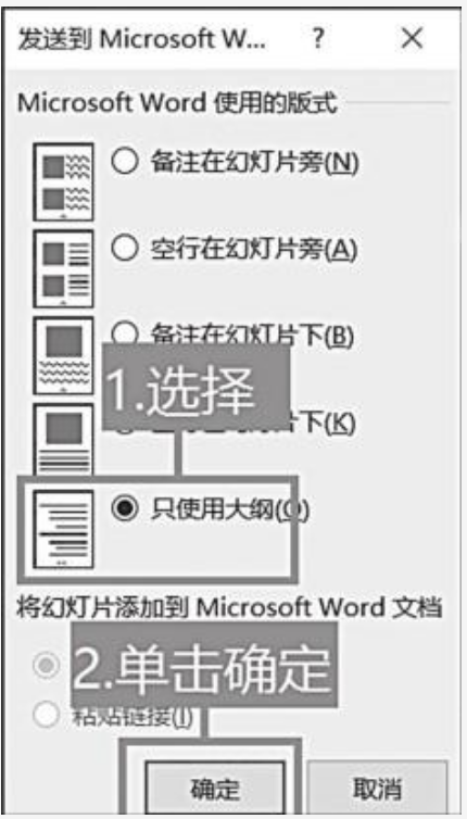 在弹出的【发送到Microsoft Word】对话框中,选择【只使用大纲】单选项,最后单击【确定】,即可完成PPT演示文稿想Word文档的转换。